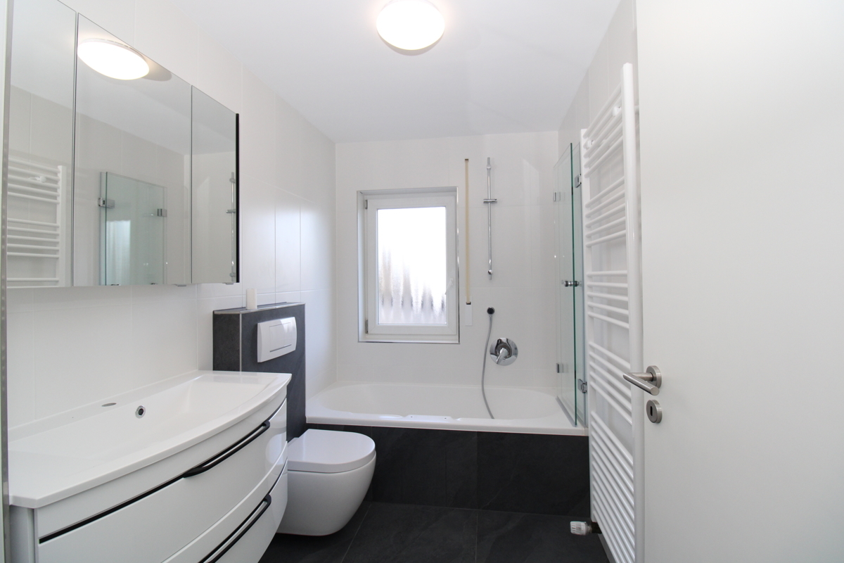 Das Bad: modern, mit Dusche, Badewanne und Fenster – schlicht, aber hochwertig.
