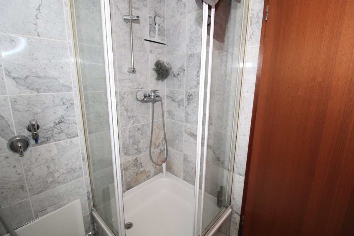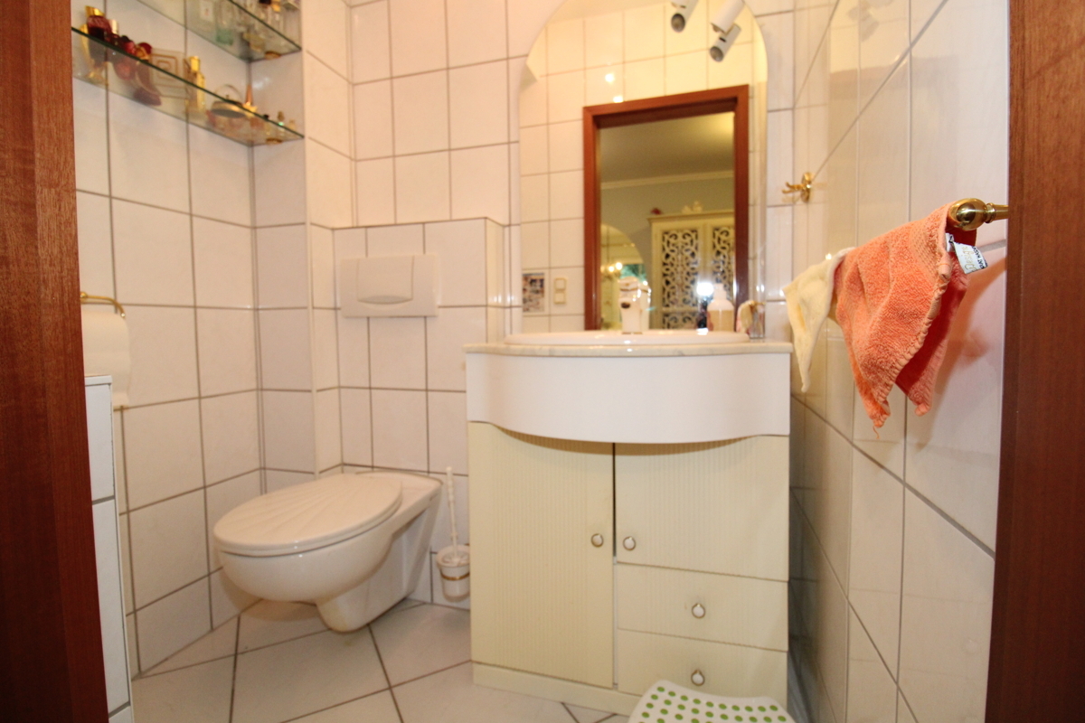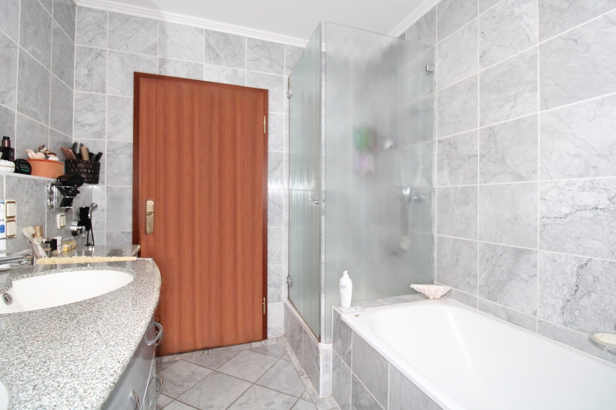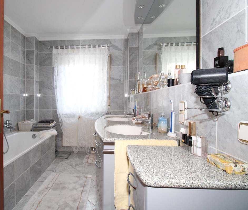Das Badezimmer ist komfortabel ausgestattet mit Badewanne, Dusche, Doppelwaschtisch, WC und Tageslichtfenster. Ein separates Gäste-WC ergänzt den Wohnkomfort.